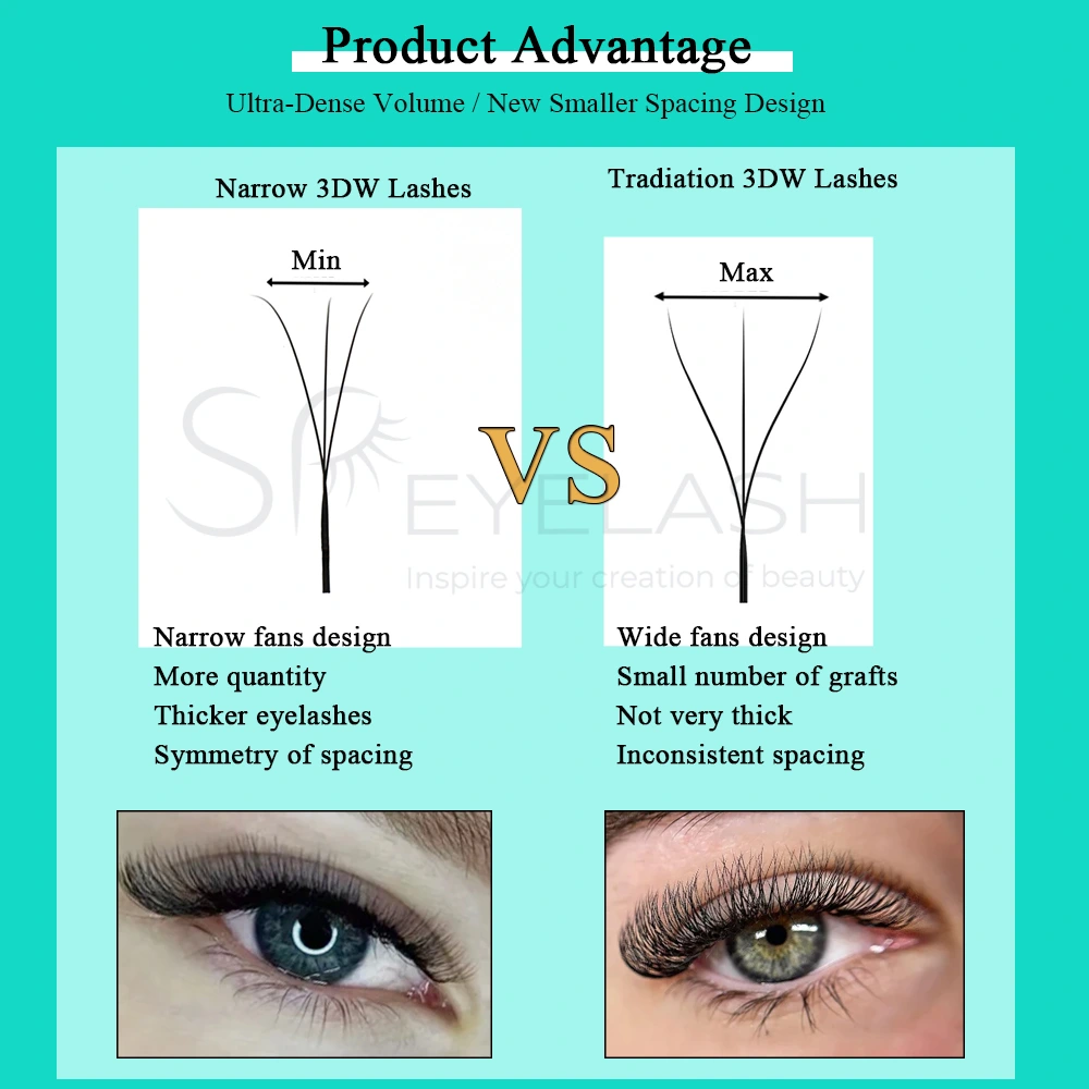 В сравнение с традиционните мигли с формата на YY, нашите модернизирани тесни разширения на YY миглите се отличават с по-малък отвор и по-гладки линии, създавайки безпроблемно свързан и по-обемният ефект на косъма. Компактната подредба намалява пропуските между миглите, създавайки естествена, но драматична пълнота. Подреждането с по-висока плътност се оформя по-дълбоки и по-пълни линии на косъм, докато по-тесният дизайн на вентилатора осигурява по-чист и по-равномерен външен вид. Междувременно по-малката база на вентилатора, сдвоена с удължена лента за мигли, създава по-голяма зона за свързване, като по този начин засилва адхезията и издръжливостта и избягва бъркотията и неравномерността, които могат да възникнат с Wide Fan W-образни мигли.